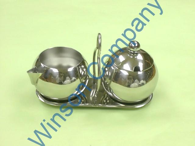 Sugar pot TB5122 TB5122 Sugar pot with lid & creamer with stand; each of dia. 8cm. TB5122 Sugar pot with lid & creamer with stand; each of dia. 8cm. 18/8 stainless steel