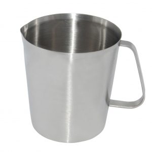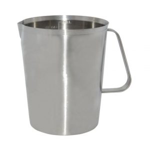 - TB0039-V1000 Water pitcher with sheet handle 12.7cm dia 13.3cm in height capacity: 1L thickness: 0.8mm Exclusive in USA. 18/8 stainless steel